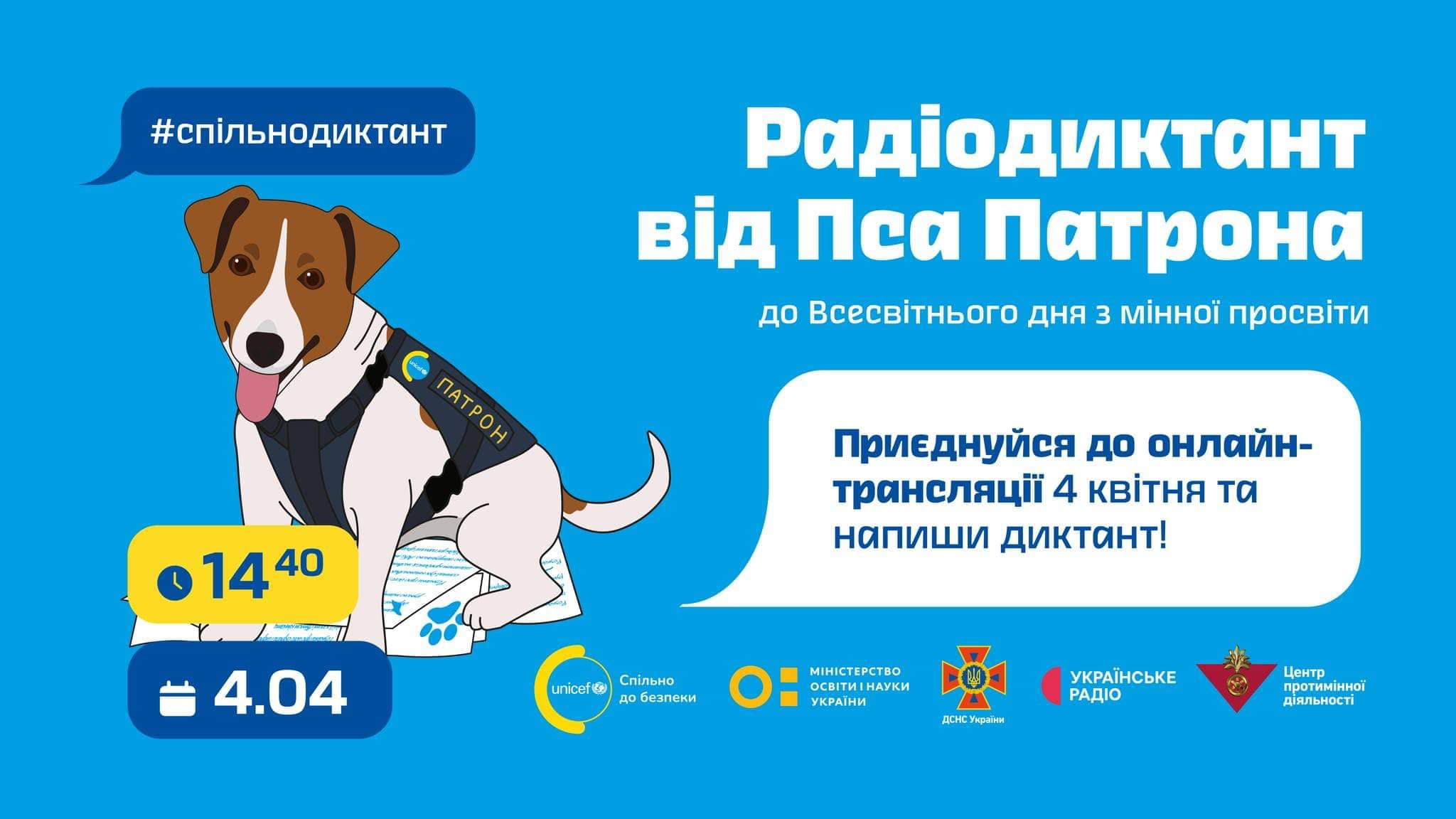 4 квітня для учнів молодшої та середньої школи проведуть радіодиктант від пса Патрона про безпечну поведінку з мінами та нерозірваними боєприпасами.