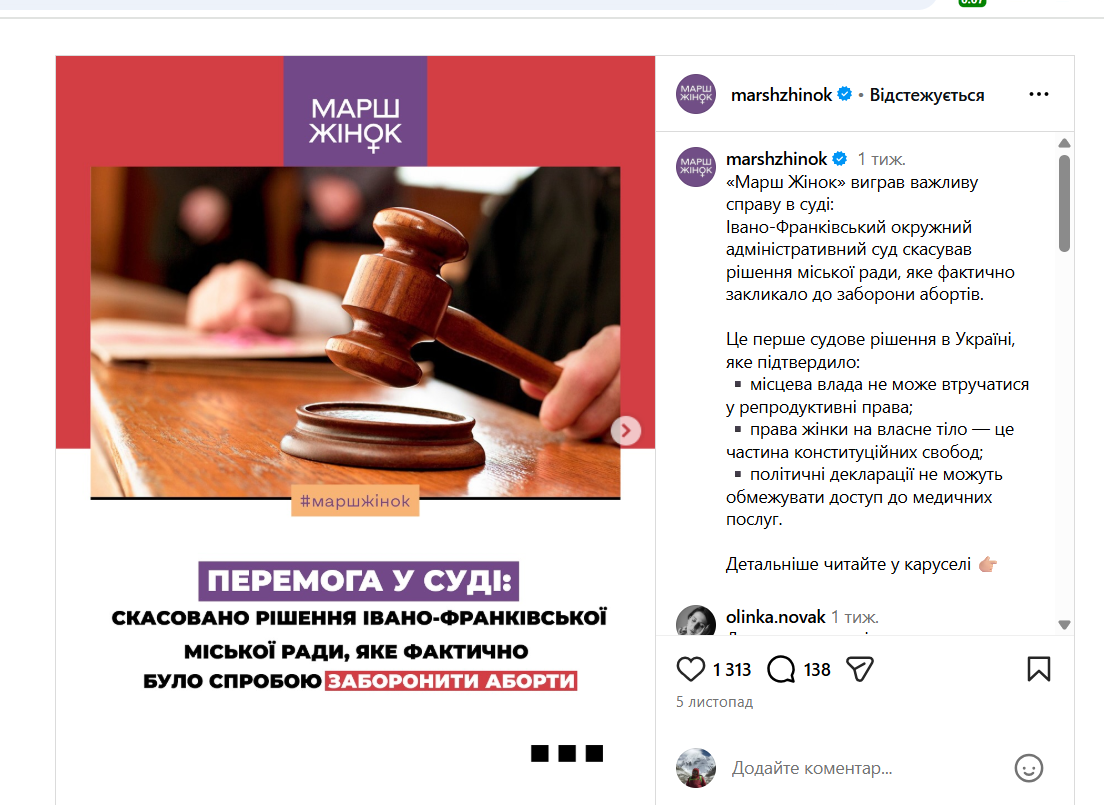 На інстаграм-сторінці ГО «Марш жінок» кілька днів тому зʼявляється банер (наведений на початку цього тексту).