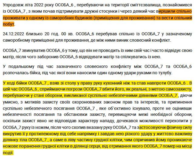 У розпал сутички Василь схопив зі столу кухонний ніж і, тримаючи його в руці, став навпроти Ігоря. Той, сприйнявши погрози вбивством як реальну небезпеку, діяв у стані самозахисту.