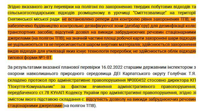 Перевірка інспекцією в лютому 2022 року виявила низку порушень: відсутність реперів, дезбар'єру, дозволу на викиди забруднюючих речовин, а також неущільнення відходів і захоронення матеріалів, що підлягають переробці.
