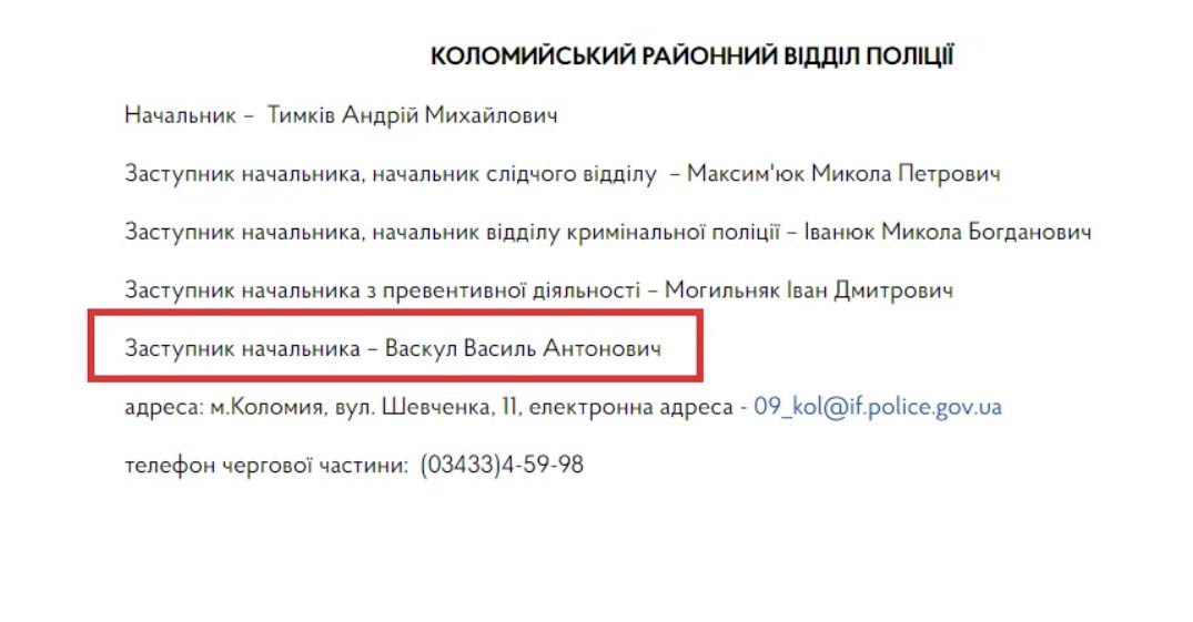 За даними аналітичної системи youcontrol, 25 жовтня Василь Васкул був звільнений за вчинення дисциплінарного корупційного проступку з посади начальника сектору реагування патрульної поліції. Очевидно, незадовго до звільнення Васкула понизили з посади заступника начальника Коломийського відділу поліції. Бо навіть на сайті обласної поліції він досі вказаний як заступник.