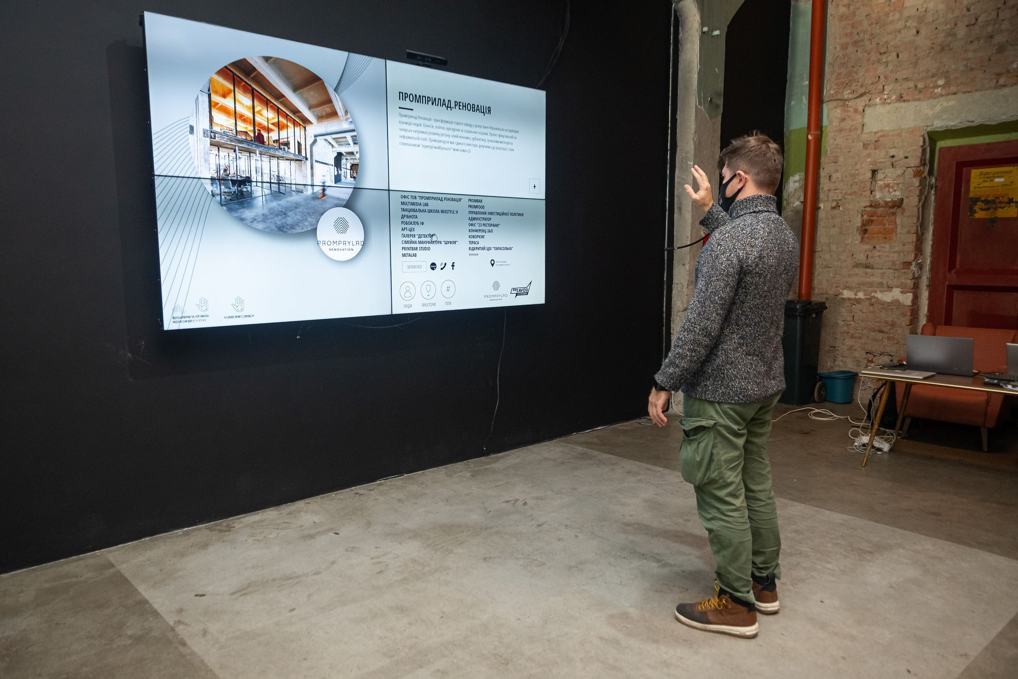 «Зараз Lokki працює в тестовому режимі. З програмою вже можна взаємодіяти, але фінальну версію ще буде доповнено. Це виглядає так: на стіні пілотного поверху Промприлад.Реновація встановлено чотири екрани. Зазвичай там транслюються різні відеоролики про Промприлад чи соціальні проєкти, які тут втілюються. Поруч на підлозі є підсвічене коло. Коли на нього хтось стає, система розпізнає людину, і відтак з’являється інший інтерактивний екран. На цей час у систему внесено інформацію про резидентів Промприладу та RE.Zavod. На екрані можна обрати один із двох просторів і далі за відповідними тегами ознайомитися з їхніми резидентами. У системі вже зареєстровано 120 підприємців. Через Lokki можна побачити короткий опис їхньої діяльності, контакти й конкретне місце розташування», — поділилася Тетяна Василик, координаторка зв'язків з партнерами Промприлад.Реновація.