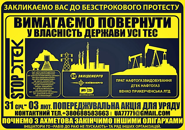 Голова ГО «Рабів до раю не пускають» Іван Спринський повідомив, що 31 січня 2017 року під гаслом «Вимагаємо повернути у власність держави усі ТЕС та посадити Донецьку мафію у тюрму», починається попереджувальна акція для уряду. Вона триватиме впродовж чотирьох днів: з 31 січня по 3 лютого.