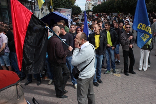 Через деякий час на площі поруч з мітингом зібралась група молодиків спортивної тілобудови, в руках яких були партійні прапори ВО «Свобода» та транспарантами, які називали Олександра Сича (справжнього) зрадником. Люди старшого віку одразу відреагували на це: почалися взаємні образи, які в кінцевому результаті перейшли у штовханину. Один з учасників мітингу видер з рук молодиків транспарант.