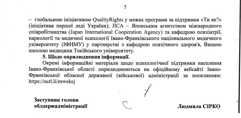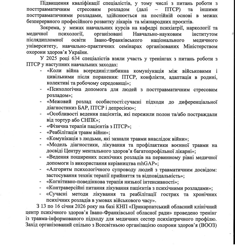 У відповіді, датованій 10 лютого 2026 року та підписаній заступницею голови облдержадміністрації Людмилою Сірко, надано конкретні дані про організацію психологічної, психіатричної та психосоціальної допомоги, яка здійснюється через структурні підрозділи ОДА, заклади охорони здоров'я, органи місцевого самоврядування, а також за участі громадських і міжнародних організацій.