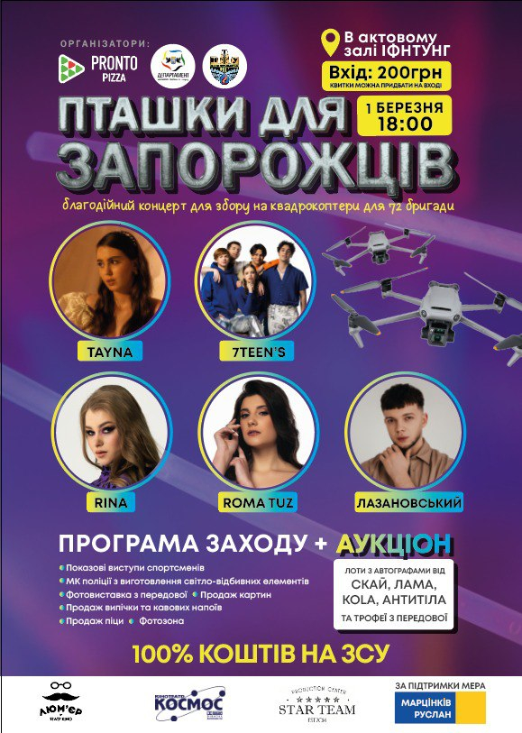 Pronto Pizza спільно з департаментом молоді та спорту організовують благодійний концерт для збору на квадрокоптери для 72 бригади "Пташки для Запорожців".