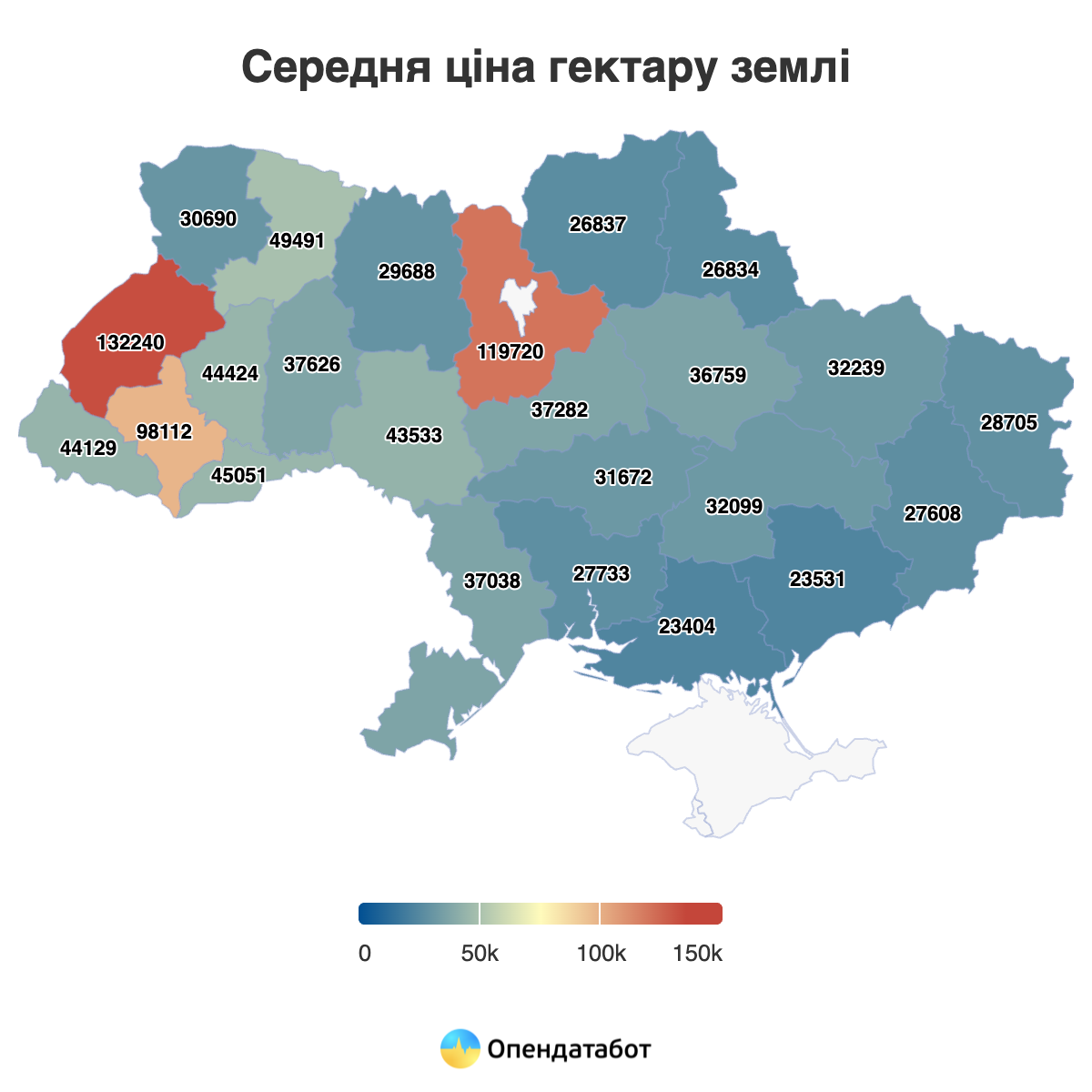 А найдорожчі угіддя виявились на Львівщині — 132 тисячі гривень за гектар. Водночас на Івано-Франківщині середня ціна — 98 тисяч гривень за гектар.