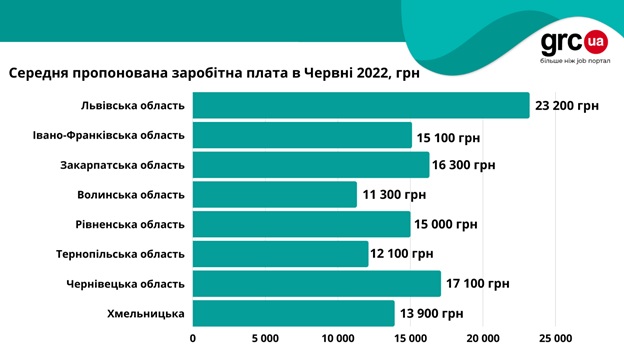 Трохи нижчі зарплати в середньому пропонують у Хмельницькій області – 13 900 грн, у Тернопільській області – 12 100 грн, найнижча середня зарплата серед усіх областей Західної України у Волинській області – 11 300 грн",- зазначили експерти.