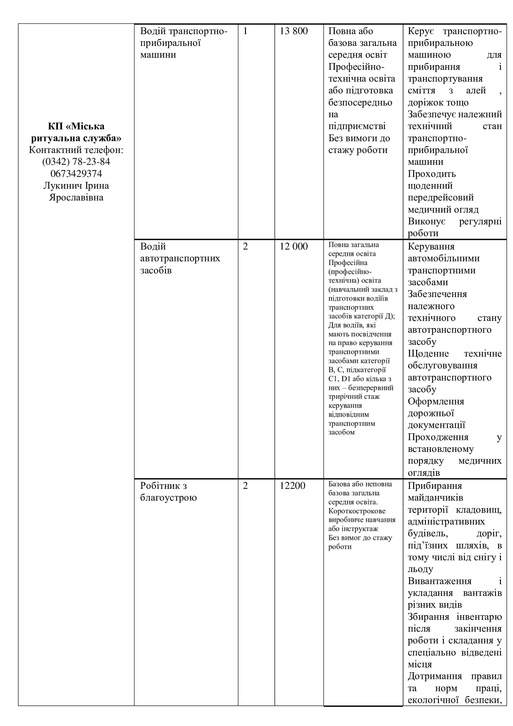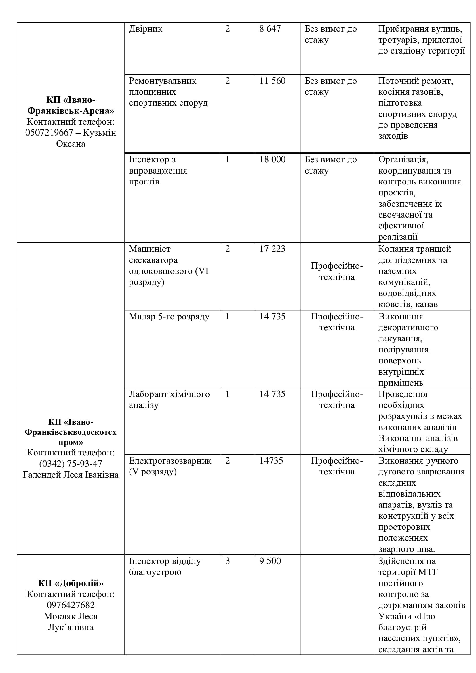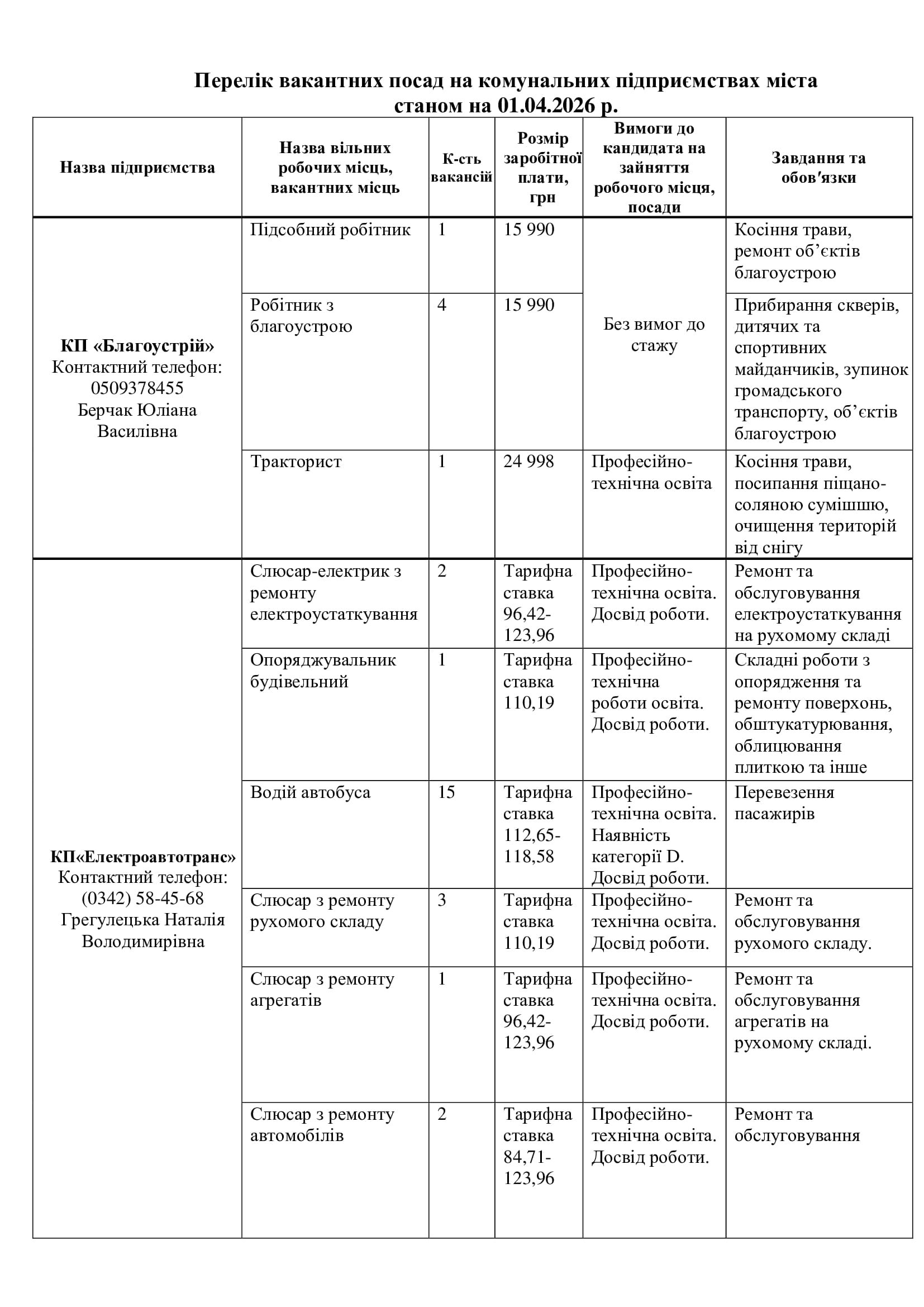 Серед актуальних посад — завідувач відділення, лаборант хімічного аналізу, робітники з благоустрою (зокрема прибирання вулиць та озеленення), водії автобусів і спецтехніки, трактористи, слюсарі, електрики, малярі, рихтувальники, агрономи, інспектори, бухгалтери, соціальні працівники та інші.
