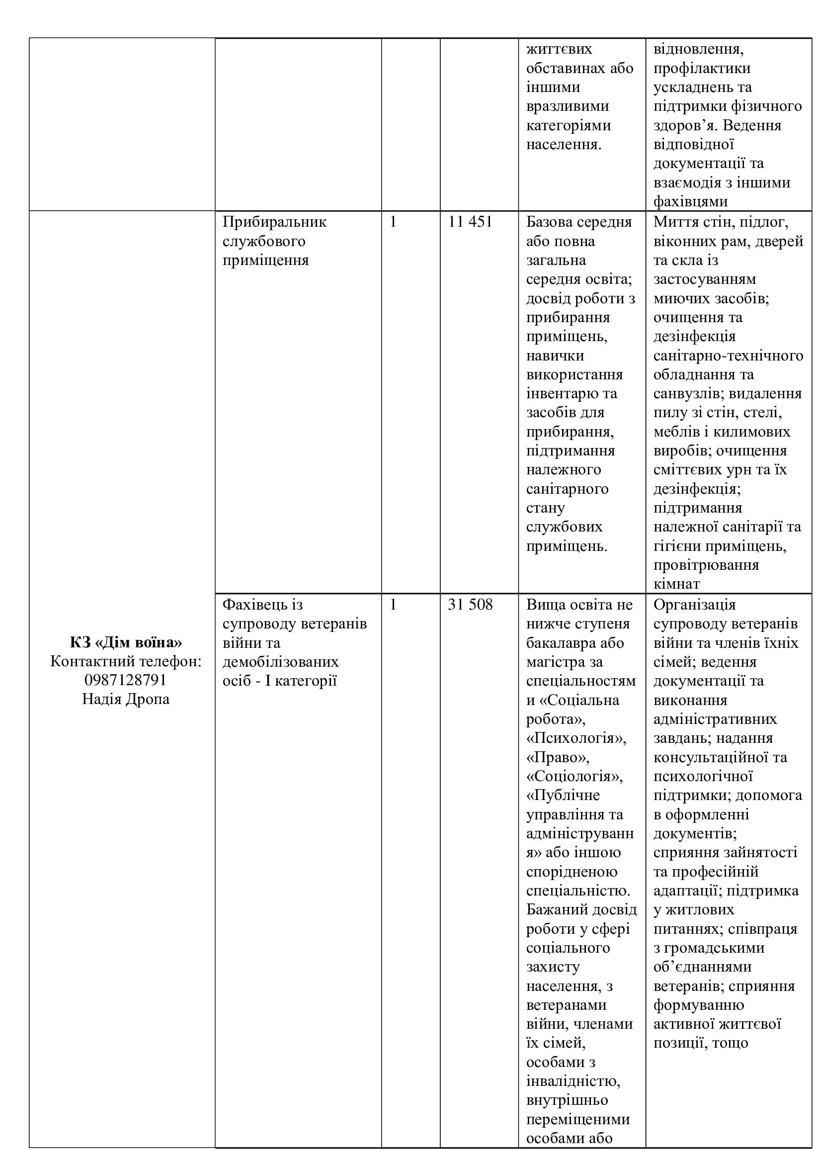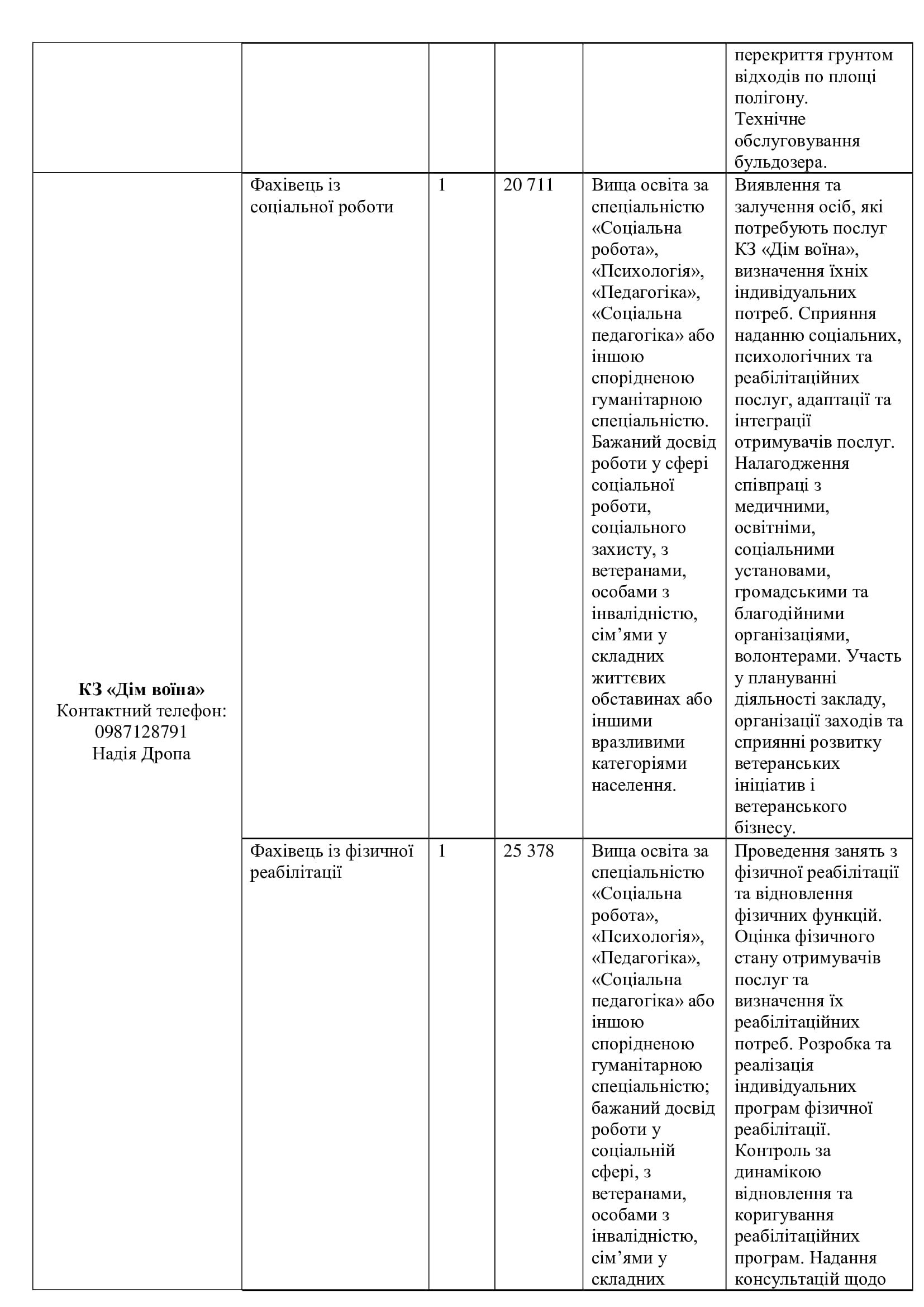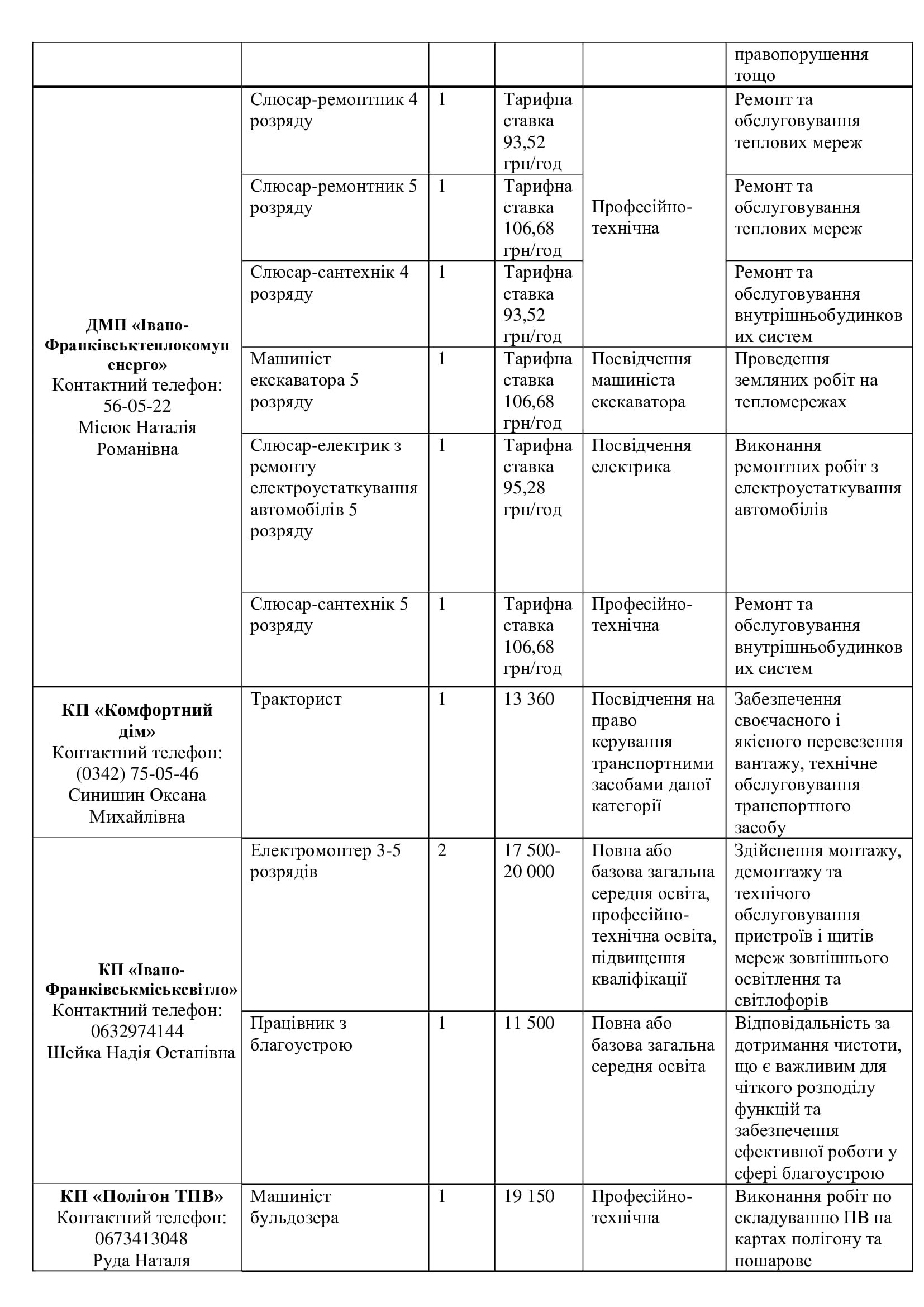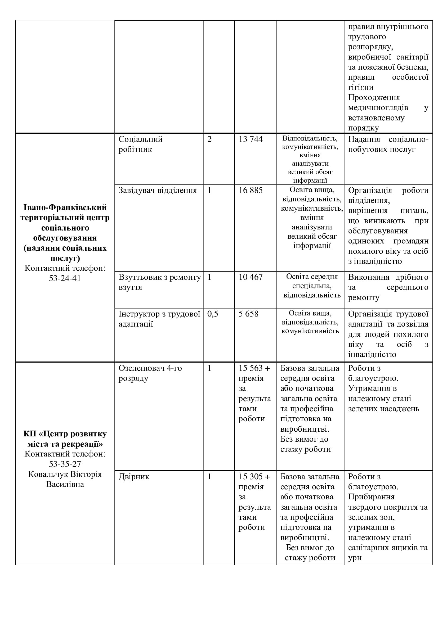 Серед актуальних посад — завідувач відділення, лаборант хімічного аналізу, робітники з благоустрою (зокрема прибирання вулиць та озеленення), водії автобусів і спецтехніки, трактористи, слюсарі, електрики, малярі, рихтувальники, агрономи, інспектори, бухгалтери, соціальні працівники та інші.