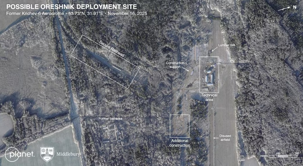 Росія ймовірно розміщує нові гіперзвукові балістичні ракети «Орєшнік», які здатні нести ядерну зброю, на колишній авіабазі на сході Білорусі, неподалік міста Кричев.