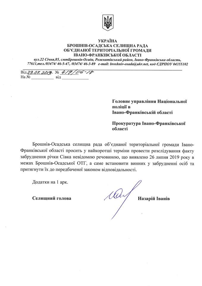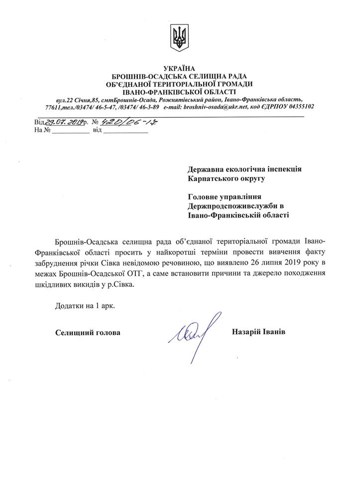 Комісією встановлено, що витік відбувається з території очисних споруд комунального підприємства Брошнів-Осадської ОТГ. Селищний голова Брошнівської ОТГ Назарій Іванів звернувся до Державної екологічної інспекції Карпатського округу та Держпроспоживслужби з проханням терміново встановити причини шкідливих скидів в річку Сівка та джерело їх походження.