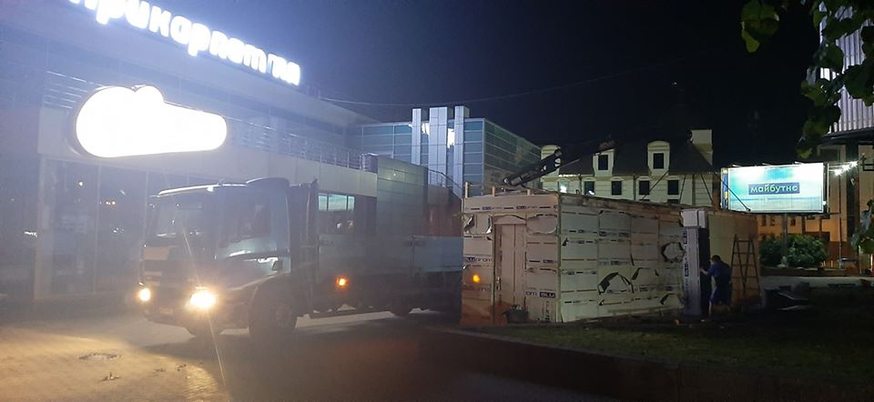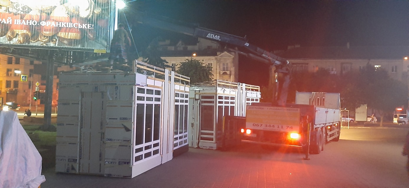 Як встановлюють нові МАФи перед універмагом показав відомий франківський актор Роман Луцький, пише Фіртка. Світлини він опублікував у соціальній мережі. Варто додати, що монтаж споруд працівники робили у нічний час.