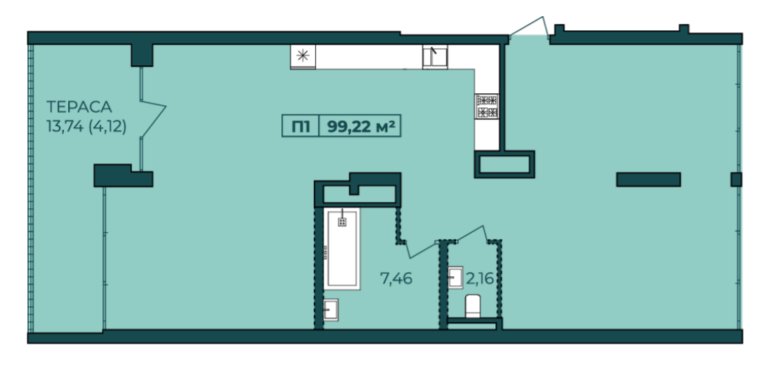Один з варіантів планувань квартири-студії площею 99 кв.м. на 16 поверсі.