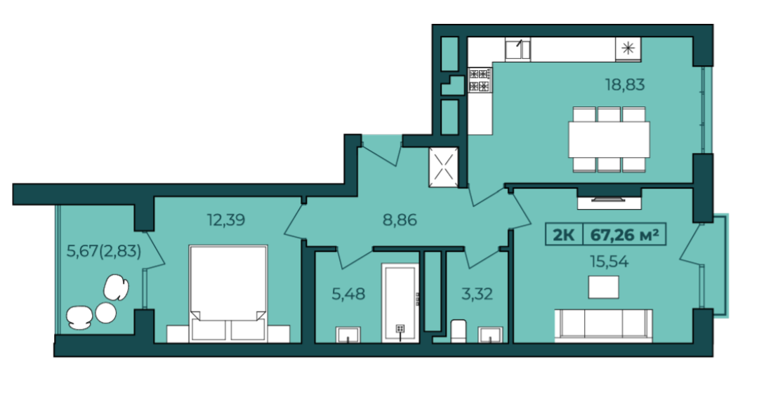 Інші планування також враховують цю особливість, як, наприклад, 2-кімнатна квартира площею 67,2 кв.м. Вона передбачає велику простору кухню площею майже 19 кв.м.