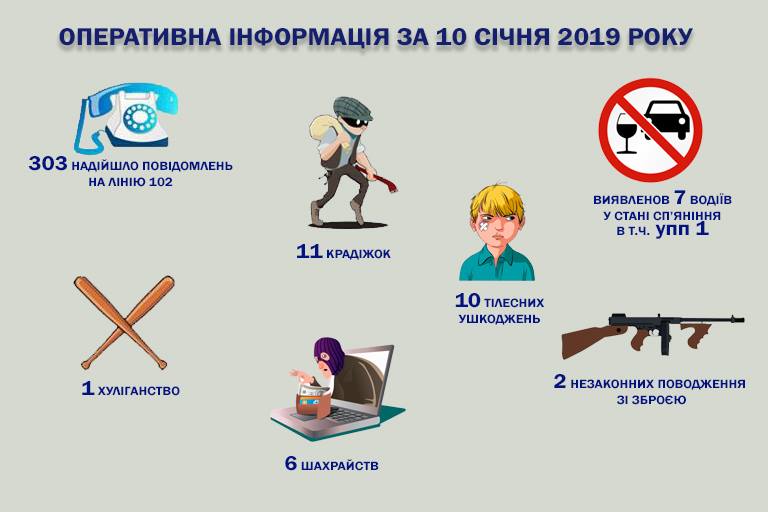 Зокрема, за минулу добу на лінію "102" надійшло 303 заяви про правопорушення. Серед яких, 11 крадіжок, 10 тілесних ушкоджень, 6 шахрайств.