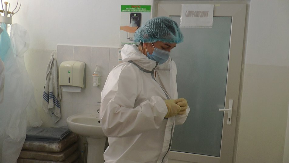 У відділенні анестезіології та інтенсивної терапії працюють дві медсестри та лікар. Верхній одяг медичні працівники переодягають на першому поверсі лікарні. Засоби індивідуального захисту розташовані окремо – в ординаторській. Одноразові медичні костюми, маски та рукавички медики змінюють кожні чотири години. Окуляри та щитки дезінфікують спеціальним розчином.
