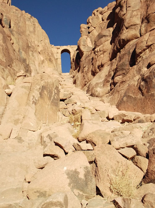 На Гору є дві дороги - довга і коротка. Довга - більш полога, довжиною 7 кілометрів. Сходження починається від знаментитого монастиря Святої Катерини. Коротка Стежка Покаяння - менше 3 кілометрів - 3750 сходинок, викладених монахами. Провідник - місцевий бедуїн, який щодня піднімається на Гору. Якщо вірити, що сходження на Гору відпускає всі гріхи, то він мав би бути безгішним...