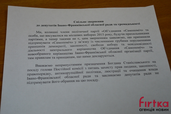 Екс-самопомочівці підготували звернення до Івано-Франківської обласної ради, в якому просять не затверджувати кандидатуру Станіславського на посаду голови постійної комісії обласної ради з питань захисту прав людини, законності, правопорядку, антикорупційної політики, люстрації та очищення влади, яке обіцяють оприлюднити на завтрашній сесії.