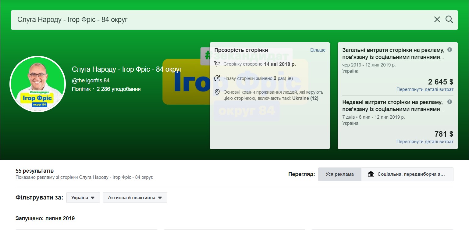 Лідером у цьому рейтингу є кандидат від "Слуга народу" Ігор Фріс, котрий витратив на рекламу за один місяць 2645 доларів. Станом на 15 липня він має 11 активних рекламних оголошень.