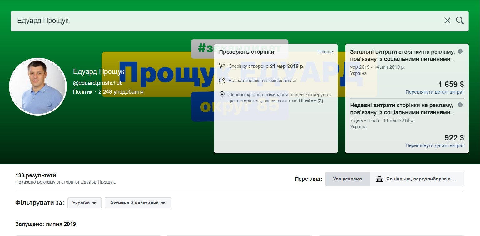 Другим йде кандидат від "Слуга народу" Едуард Прощук, якому обійшлася реклама станом на сьогодні у 1659 доларів і має наразі 13 активних інформацій.