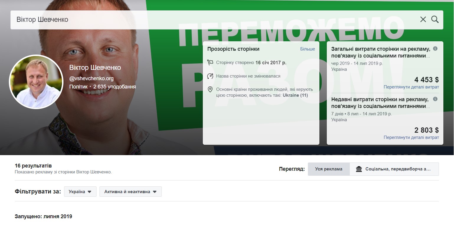Лідером є кандидат-самовисуванець Віктор Шевченко котрий витратив на рекламу за один місяць 4 453 доларів. Станом на 16 липня він має 9 активних рекламних оголошень.