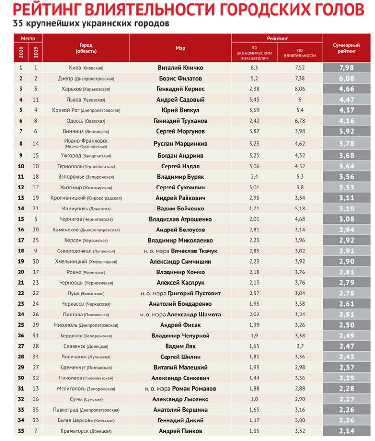 Під час дослідження 14 експертів оцінювали очільників 35-ти найбільших міст України за двома категоріями показників – це політична складова та економічна частина впливовості.