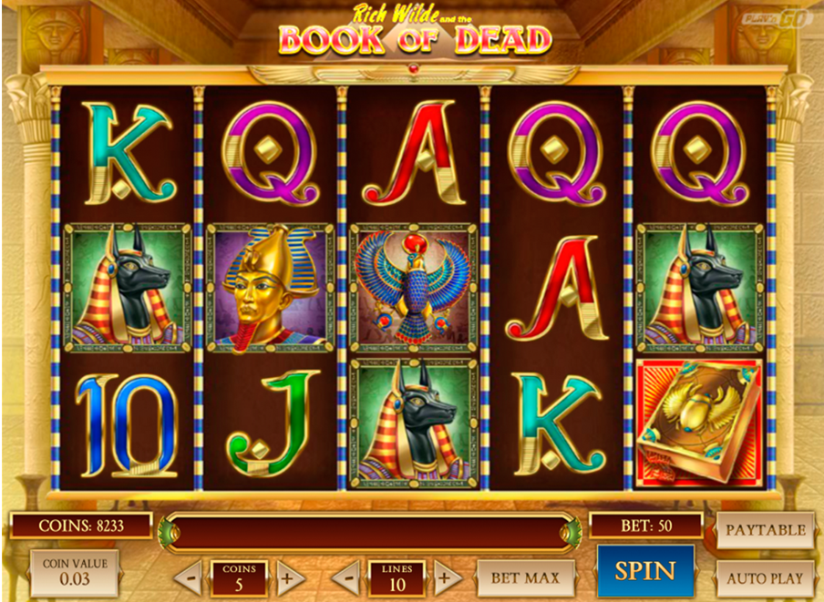 Книга Мертвих є 5-барабанний, 10-плайновий відео слот від розробника Play 'N Go, заснований на новій сюжетної лінії з шукачем пригод Rich Wilde. Після попередніх глав з "Ідолами ацтеків" і "Перлинами Індії" Річ Уайльд повернувся, і його пригоди привели його до пірамід Стародавнього Єгипту, де Анубіс відкрив ворота в підземний світ.