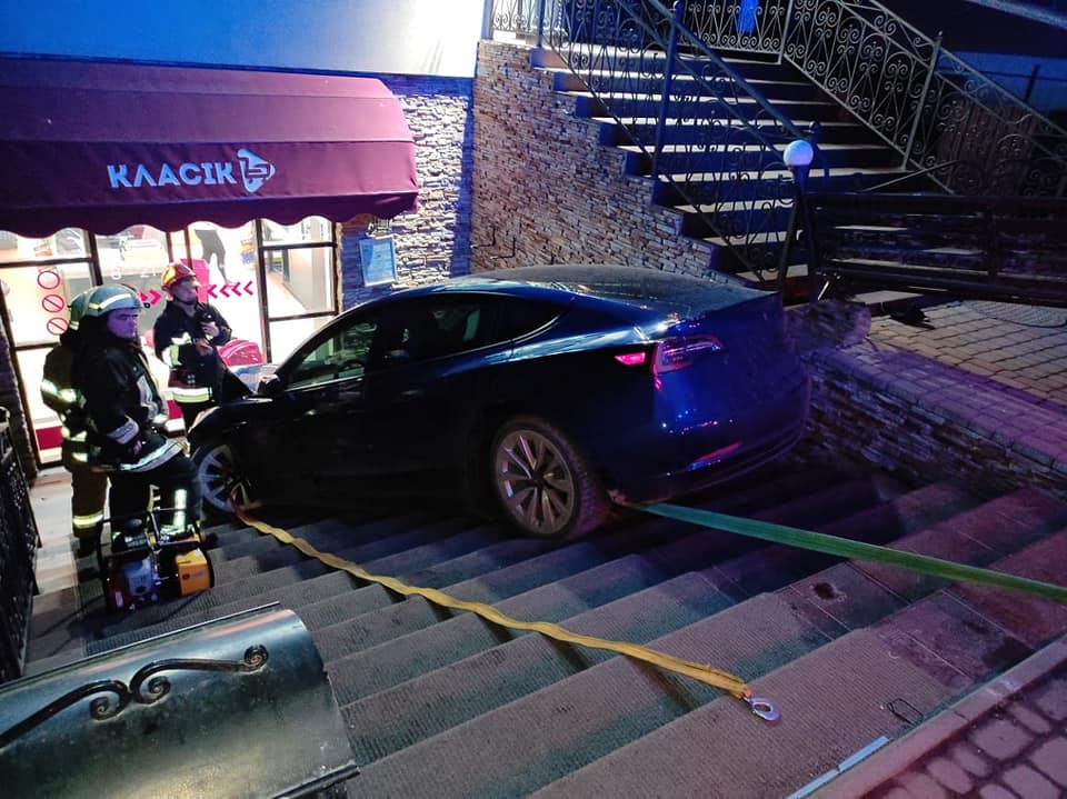 Автомобіль марки "Тесла" під час паркування біля супермаркету не врахував дорожньої ситуації, вчасно не загальмував і з'їхав сходами вниз до магазину.