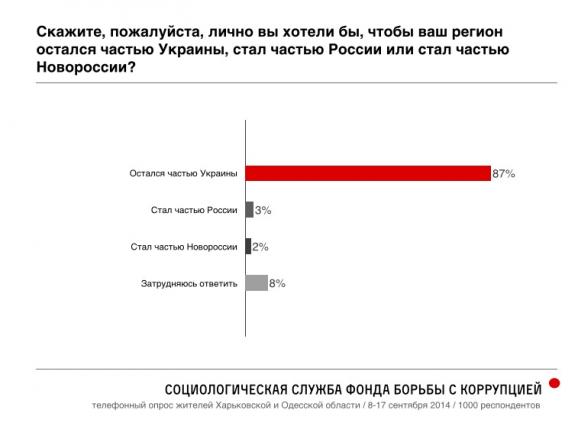 Опитування провели серед мешканців тих областей, які сепаратисти та малограмотні росіяни вважають «Новоросією» – Харківської та Одеської, оскільки наразі провести опитування серед мешканців Донецької та Луганської областей є неможливим. До того ж, Харківська та Одеська області вважаються «проросійськими».