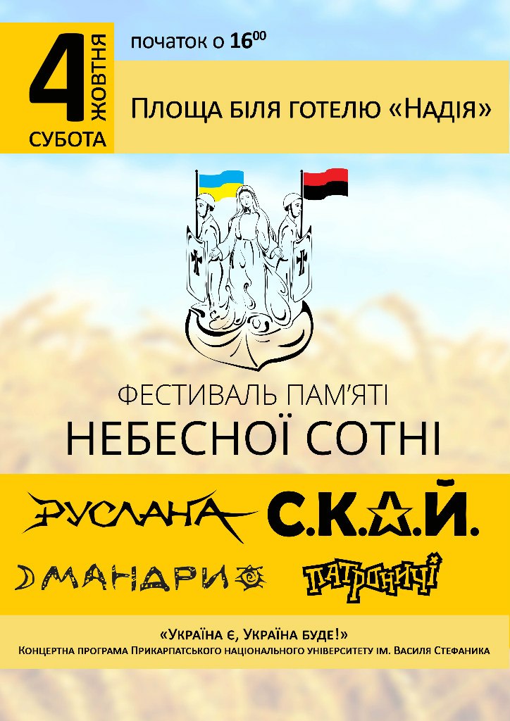 О 16:00 на площі біля готелю “Надія” розпочнеться концерт за участі відомих українських артистів — гуртів “Скай” та “Мандри”, Руслани та Івано-Франківського гурту “Патроничі”.
