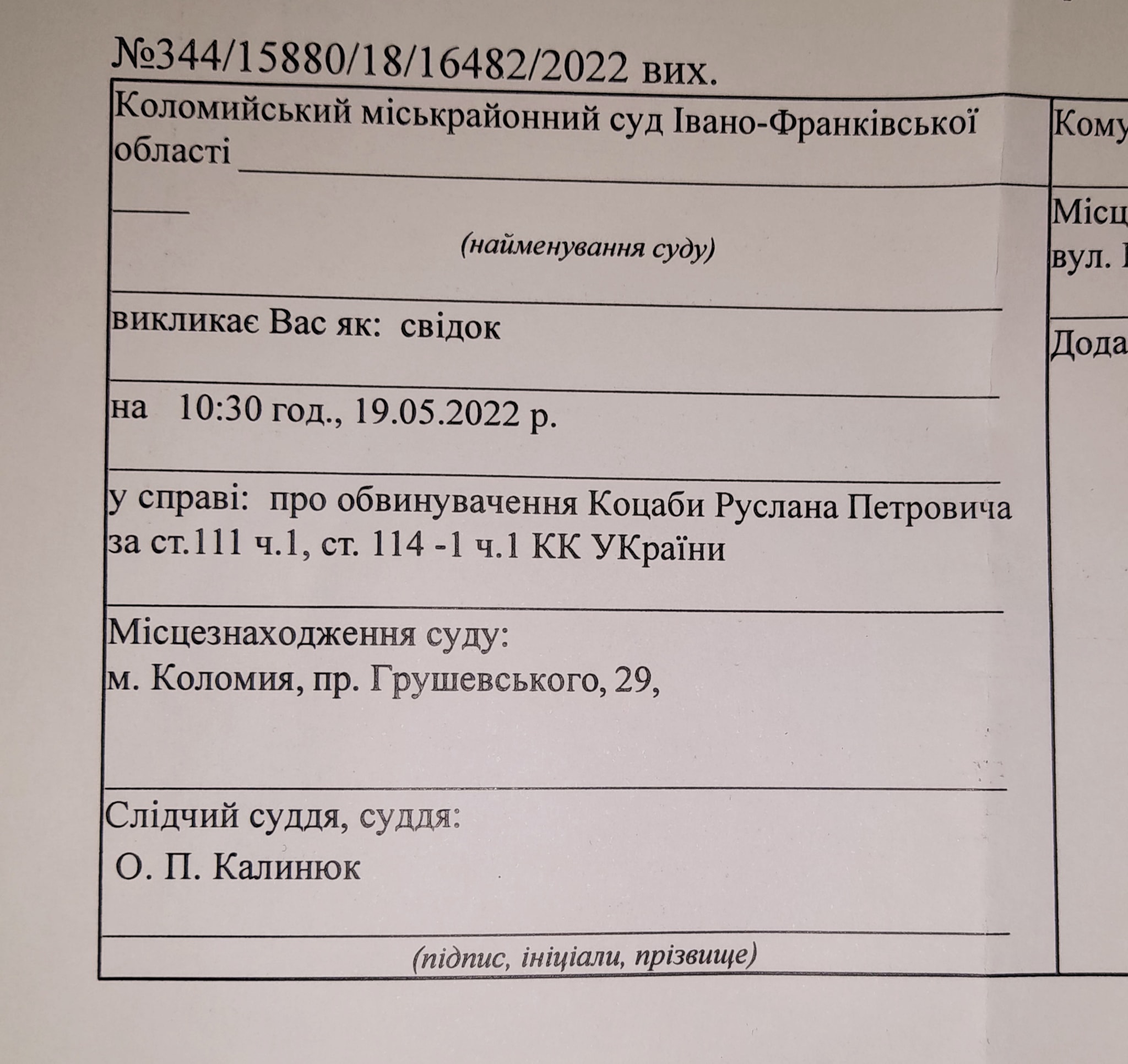 Коломийський міськрайонний суд 19 травня на 10.30 призначив чергове судове засідання по кримінальному провадженні про обвинувачення журналіста Руслана Коцаби за ч.1 ст. 111, ч. 1 ст. 114 -1 КК України - державна зрада. Це вже третя спроба продовжити розгляд справи слухання якої переносилися через неявку свідків та війну в Україні.