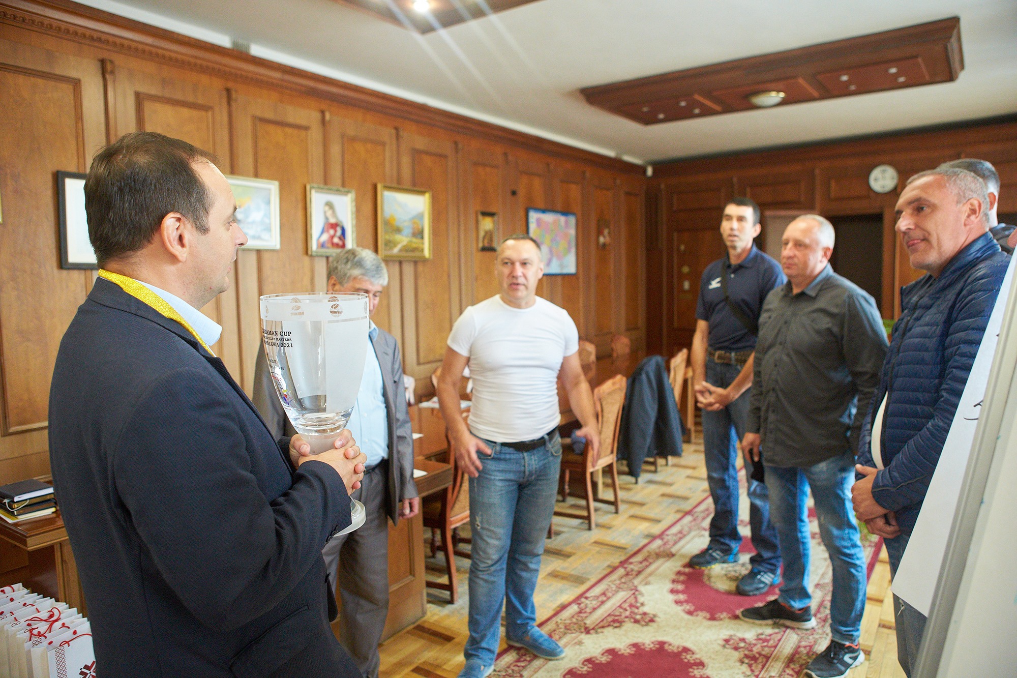 "Сьогодні мав приємну зустріч. До мене завітали ветерани волейболу, які перемогли на етапі XI кубку світу серед ветеранів, який пройшов у Варшаві. Приємно було отримати кубок та медаль. Бажаю нашим ветеранам майбутніх спортивних перемог", - радіє Руслан Марцінків.