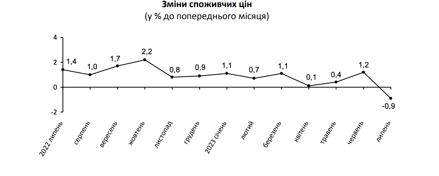 Так, у липні зниження споживчих цін на 1,2–0,2% зафіксували майже в усіх регіонах України, за винятком Черкаської та Харківської областей, де споживчі ціни зросли на 0,1–0,2%.