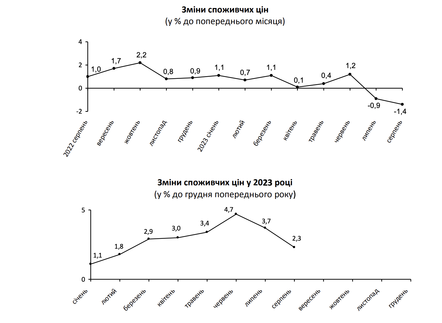 Споживчі ціни в серпні 2023 року порівняно з липнем цього року як в області, так і в Україні знизилися на 1,4%, з початку року —зросли на 2,3% та 2,5% відповідно.