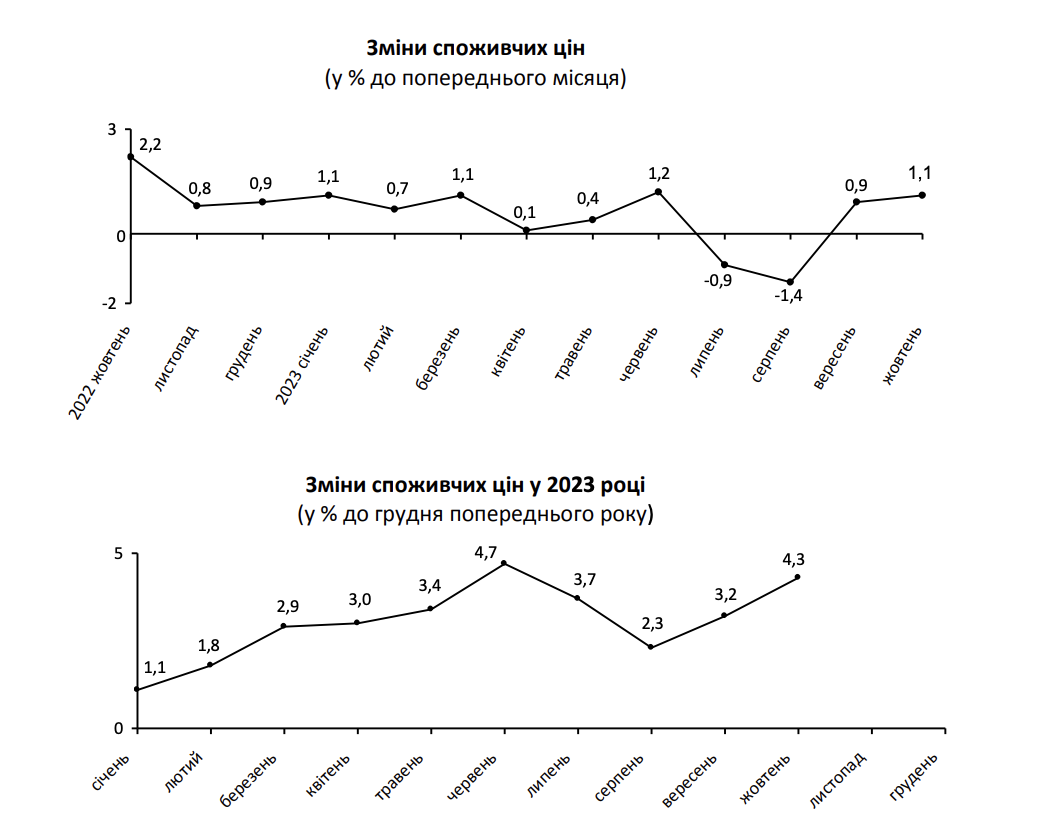 Інфляція на споживчому ринку в жовтні 2023 року порівняно із вереснем 2023 року на Прикарпатті становила 1,1%, з початку року — 4,3%, в Україні — 0,8% та 3,8% відповідно.