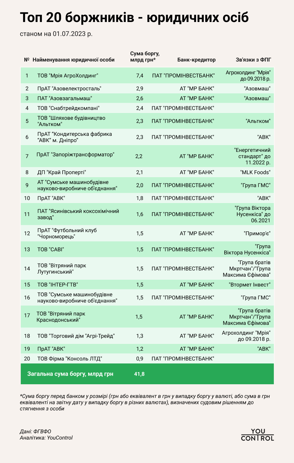 Сума боргу двадцятки найбільших боржників — юридичних осіб становить 41,8 млрд грн, що складає понад 57% від загальної суми заборгованості перед збанкрутілими установами. Боржники із найбільшою сумою неповернутих кредитів обслуговувались у двох банках — ПАТ "ПРОМІНВЕСТБАНК" та АТ "МР БАНК" (колишній АТ "СБЕРБАНК").