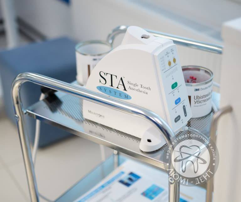 • При найменшому дискомфорті пацієнту вводиться анестетик. Для цього не використовуються навіть шприц з голкою, що попереджає ймовірність виникнення у пацієнта стресу. Комп'ютерна анестезія STA підходить дітям і дорослим, відрізняється безболісністю. Вона діє локально тільки в тому місці, де лікар здійснює маніпуляції.