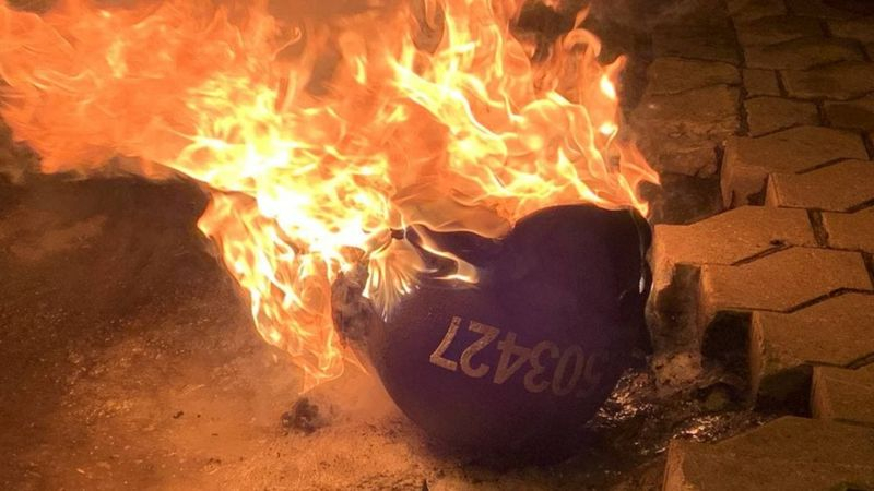 О 21:25 год демонстранти спалили кілька зірваних шоломів правоохоронців.