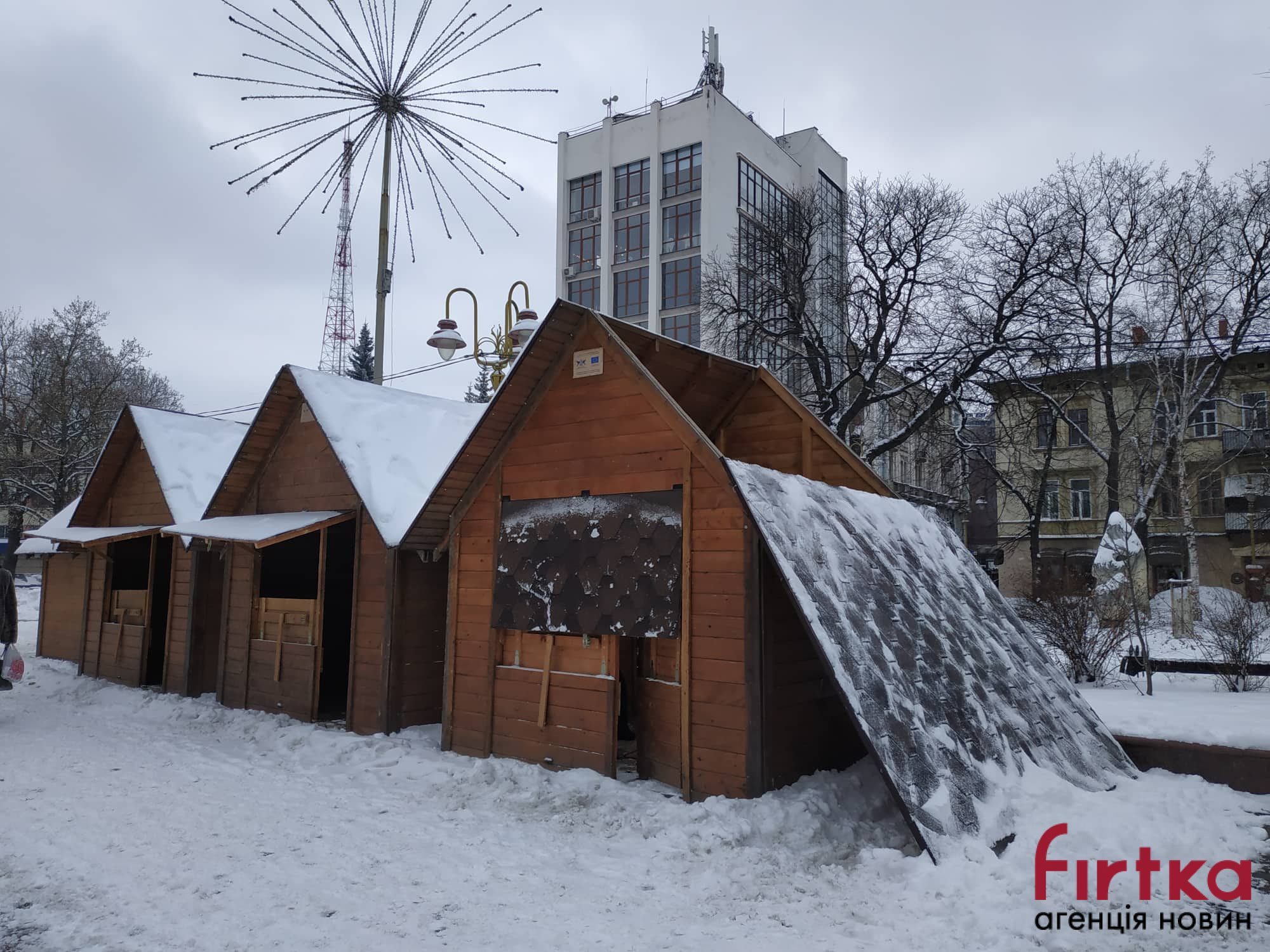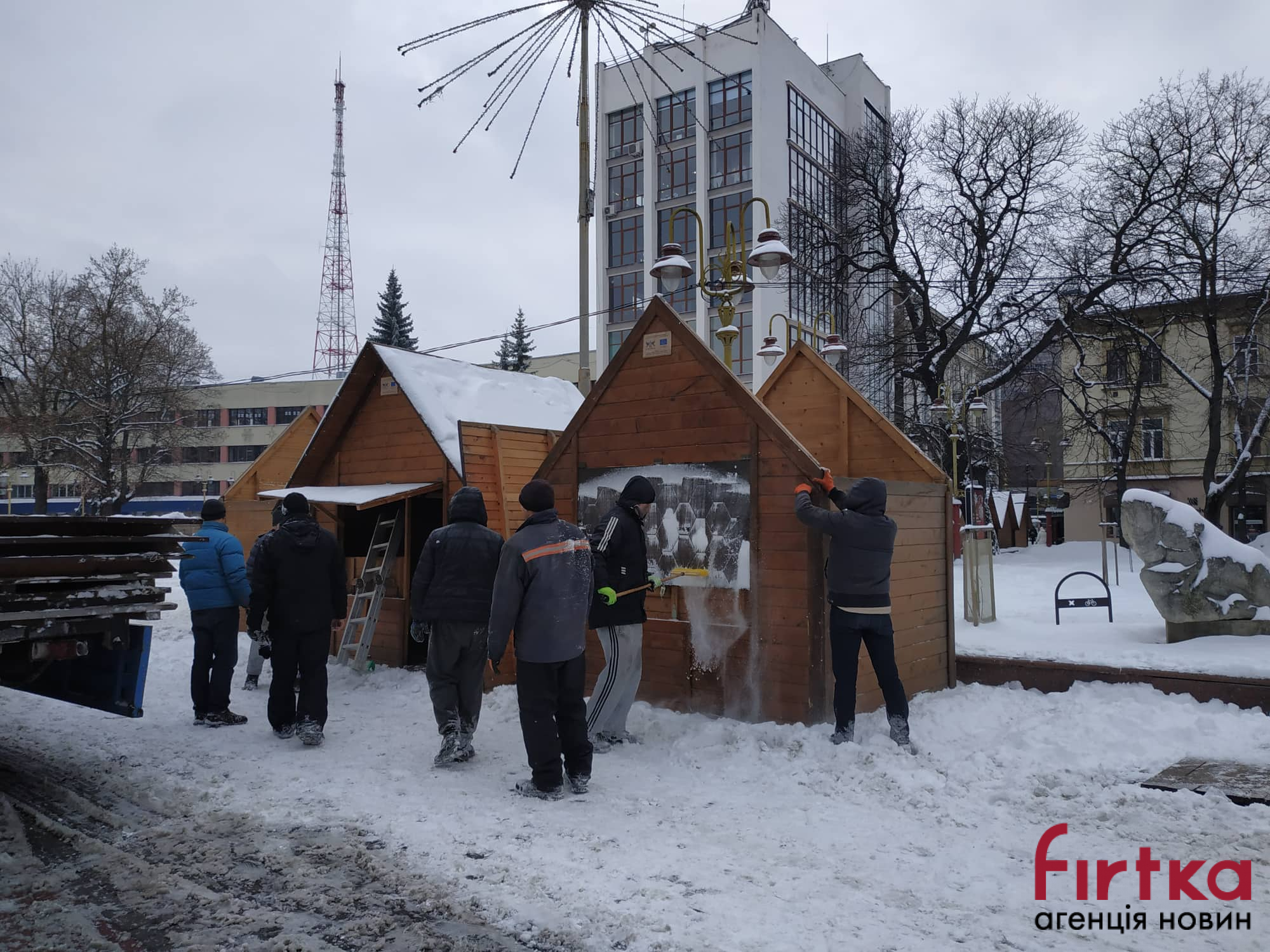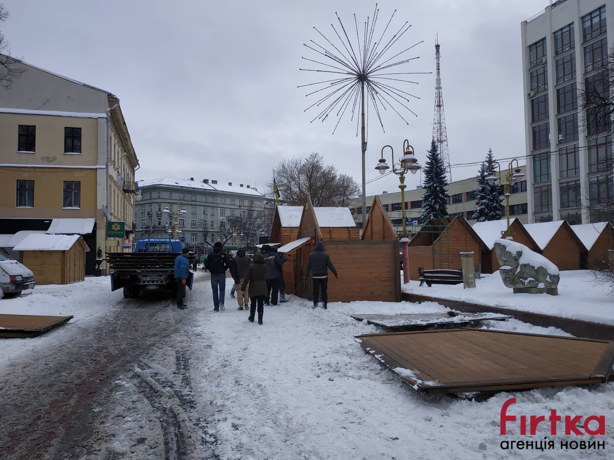 У Франківську на Вічевому майдані проводять демонтаж дерев’яних ярмаркових будиночків.