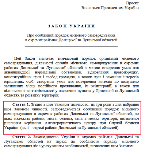 "Згідно з цим Законом тимчасово, на три роки з дня набрання цим Законом чинності, запроваджується особливий порядок місцевого самоврядування в окремих районах Донецької та Луганської областей, до яких належать райони, міста, селища, села в межах території, визначеної рішенням керівника Антитерористичного центру при Службі безпеки України (далі – окремі райони Донецької та Луганської областей)".