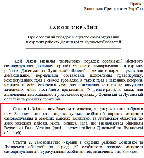 "Згідно з цим Законом тимчасово, на три роки з дня набрання цим Законом чинності, запроваджується особливий порядок місцевого самоврядування в окремих районах Донецької та Луганської областей, до яких належать райони, міста, селища, села, що визначаються рішенням Верховної Ради України (далі – окремі райони Донецької та Луганської областей)".
