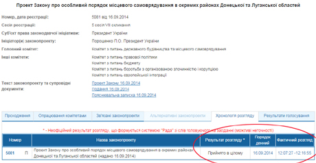 Невідомо, в який саме момент було внесено такі правки, оскільки ще о 12:05, перед самим початком розгляду, згідно з даними сайту ВР, було оприлюднено першу версію тексту.
