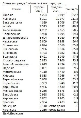 Перше місце серед найдорожчої оренди у 2022 році зайняла Львівська область. З 5 191 гривні на місяць за грудень 2021 року вона піднялась на 111,5% і становила близько 10 977 гривень у відповідний період 2022 року.