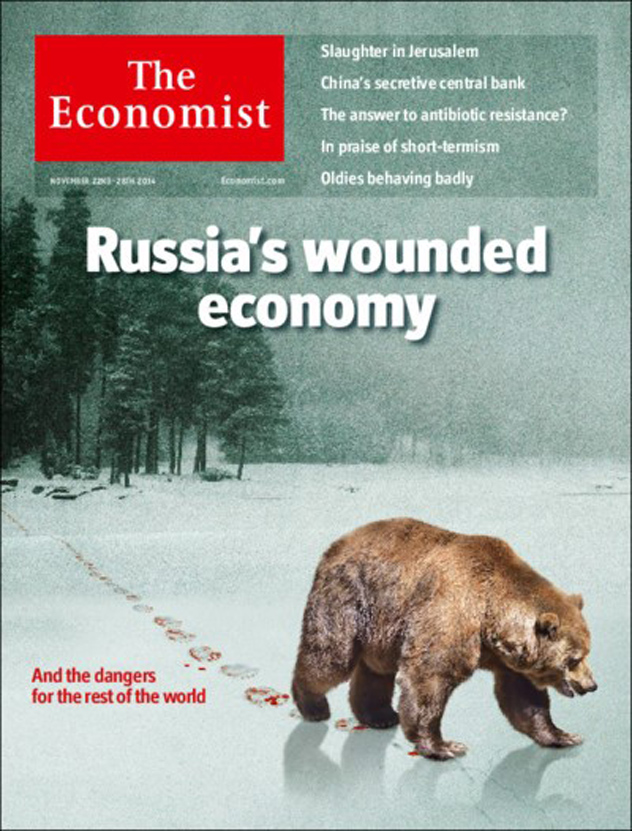 У Владимира Путина хватает трудностей, и многие он создал себе сам: война на востоке Украины, напряженные отношения с Западом, даже с Германией, исламисты у границ. Но есть проблема, которая может затмить все вышеназванные: раненая российская экономика может впасть в кризис, и есть шансы, что случится это раньше, чем кто-либо ожидает, – такую мысль развивает Economist в кавер-стори свежего номера. В текущем году это уже восьмая обложка, посвященная России.