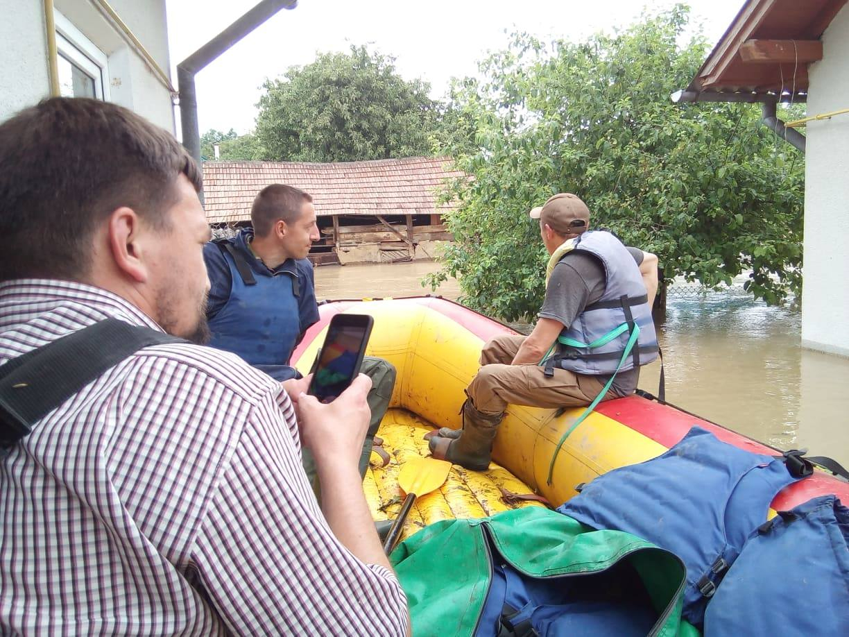 "В обід ми зробили сплав, тримаючись між стовпами, де була раніше дорога. Сільський голова переконав бабцю покинути затоплену хату, але з умовою, що разом з курми, наші певний час ловили курей по хаті. Цікаво, що хата в бабці добре закривалася зсередини, але ніяк не хотіла закриватися ззовні. Напевно, довший час в неї просто не було потреби закриватися ззовні, виходити за межі подвір'я. З другої хати, де також передумали, везли у мішку котів...", - написав Андрій Мельничук.