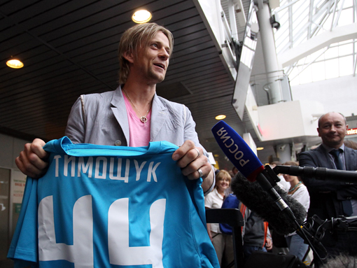 Півзахисника збірної України Анатолія Тимощука, що повернувся до лав "Зеніта" на виїзді з аеропорту Пулково-2 зустріли не лише журналісти, а й група фанатів.