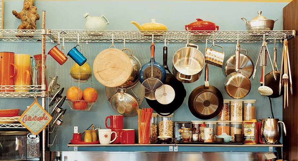 Проблема більшості невеликих квартир — брак корисного простору. Саме тому практичним стає рішення перетворити стіну на додаткову систему зберігання. Для цього потрібна лише спеціальна металева трубка та гачки, на яких висітиме кухонне начиння. Таке рішення чудово підходить для невеликих кухонь. Головне правило — не перевантажувати рейлінг.