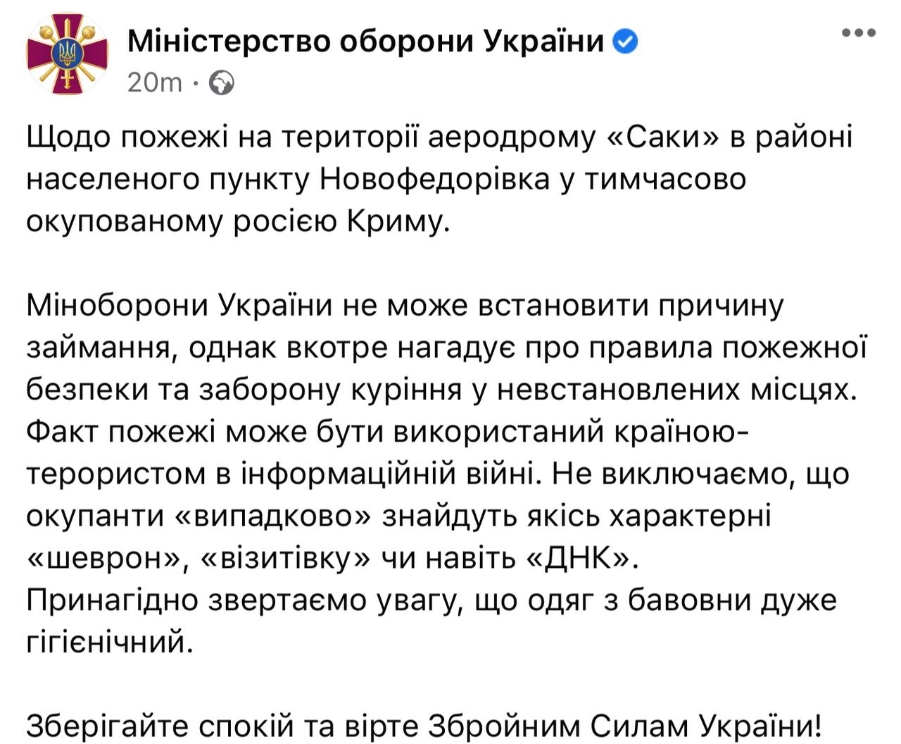 Водночас Міністерство оборони України нагадало про правила пожежної безпеки та заборону куріння у невстановлених місцях, реагуючи на пожежу на авіабазі у Криму.