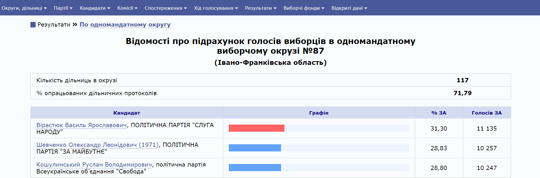 Станом на ранок четверга на першому місці залишається кандидат "Слуги народу" Василь Вірастюк з 31,30%.